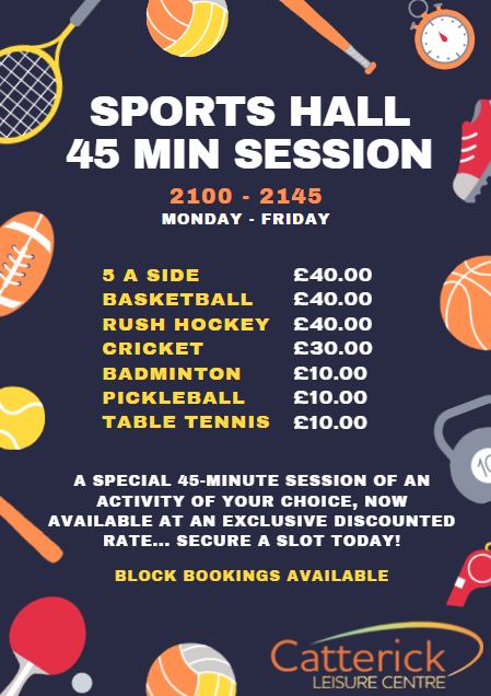 Sports Hall Booking3 Feb 2026 | UncategorisedSpecial 45 Minute Sports Hall OfferBook with the Reception Team01748831030enquiries@catterickleisurecentre.co.uk#sportshall #savemoney #discounts